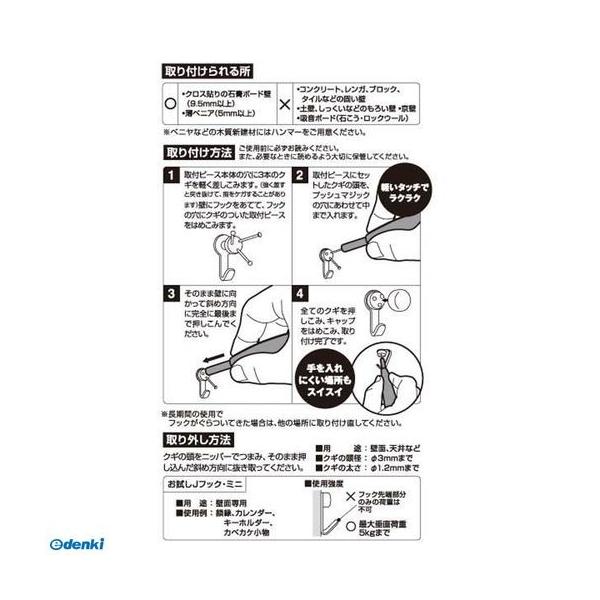 【商品説明】●クギ押し作業が簡単ラクラク!石こうクギ用便利工具。●軽いタッチでラクラク!誰でもミスなくサクサク!●手を入れにくい場所もスイスイ!●お試しに「Jフック・ミニ」1セット付!●取付けられる場所:クロス貼りの石膏ボード壁(9.5mm以上)●材質:プッシュマジック(本体:ポリアセタール樹脂、芯:鉄)、フック(本体:鉄、キャップ:ポリエチレン、取付ピース:ABS樹脂、クギ:ステンレス)