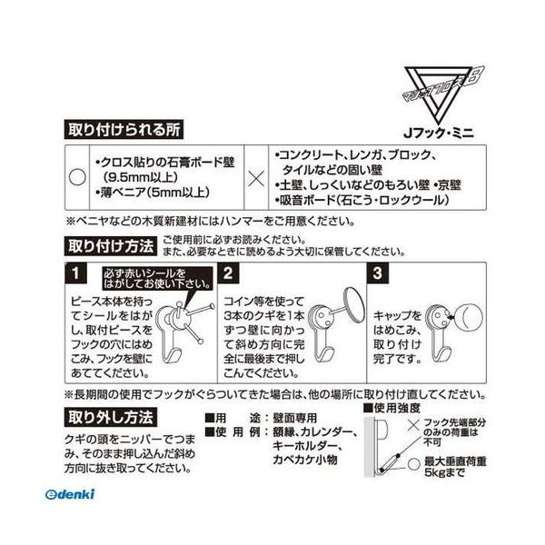 【商品説明】●クギがクロスして、石膏ボード壁に強力固定!●抜き跡が目立たない!●コイン等で取付け簡単!●壁面専用。使用例:額縁、カレンダー、キーホルダー、カベカケ小物●取付けられる場所:クロス貼りの石膏ボード壁(9.5mm以上)、薄ベニヤ(5mm以上)●●ベニヤなどの木質新建材にはハンマーをご用意ください。●●石膏ボード壁の取り付けには、専用工具(プッシュマジック、クギ押しくん)もございます。●耐荷重:5kg●色:ホワイト●材質:本体:鉄、キャップ:ポリエチレン、取付ピース:ABS樹脂、クギ:ステン