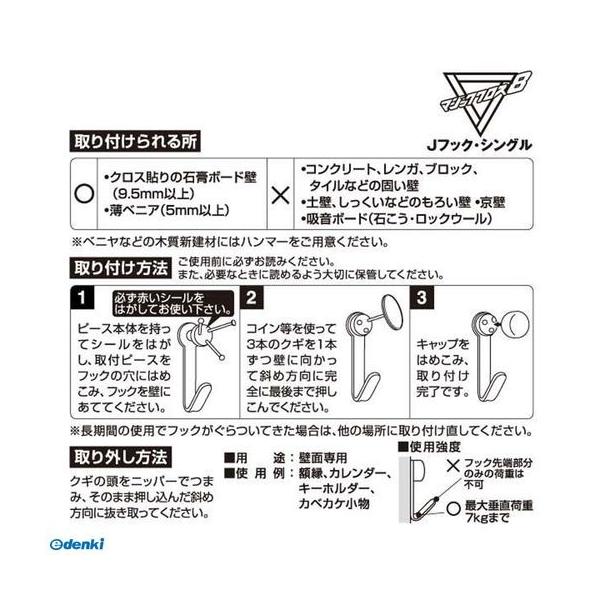 【商品説明】●クギがクロスして、石膏ボード壁に強力固定!●抜き跡が目立たない!●コイン等で取付け簡単!●壁面専用。使用例:額縁、カレンダー、キーホルダー、カベカケ小物●取付けられる場所:クロス貼りの石膏ボード壁(9.5mm以上)、薄ベニヤ(5mm以上)●●ベニヤなどの木質新建材にはハンマーをご用意ください。●●石膏ボード壁の取り付けには、専用工具(プッシュマジック、クギ押しくん)もございます。●耐荷重:7kg●色:ニッケルメッキ●材質:本体:鉄、キャップ:ポリエチレン、取付ピース:ABS樹脂、クギ: