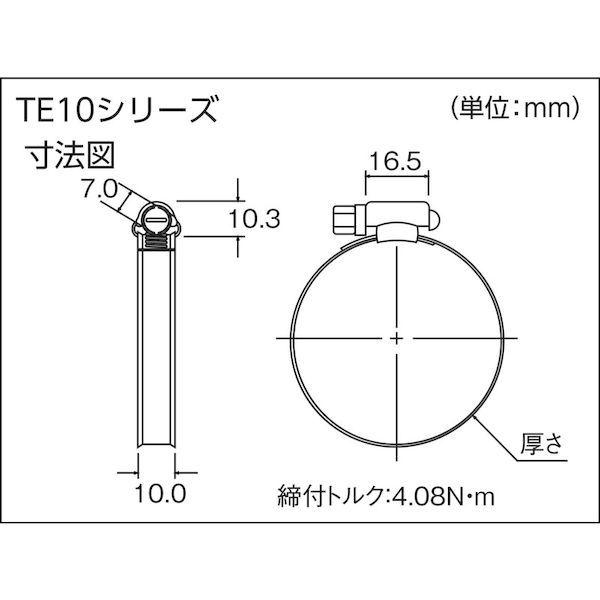 【特長】●オールステンレスを採用しているため、耐腐食性が高いです。●バンドのエッジ部分にR加工がされているのでホースを傷つけにくいです。●シール性とトルクのバランスが優れています。【用途】●自動車、ゴム、バイク、建機、大型車などに。【仕様】●最大径(mm):20●最小径(mm):12●厚さ(mm):0.7●締付トルク(N・m):4.08●バンド幅(mm):10●6角ボルト(mm):7【仕様2】●6角ボルト:7mm【材質/仕上】●ステンレス(SUS304)【原産国】台湾