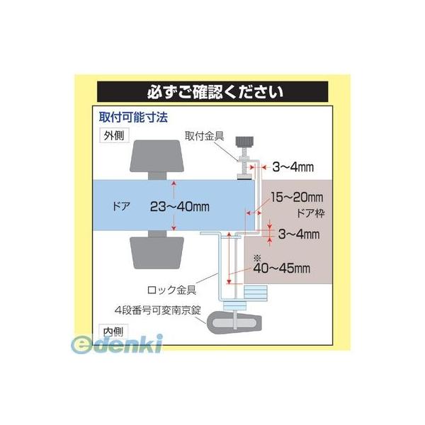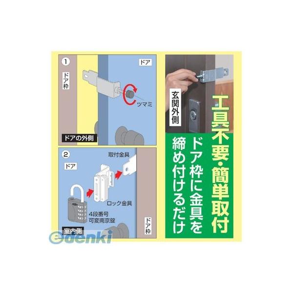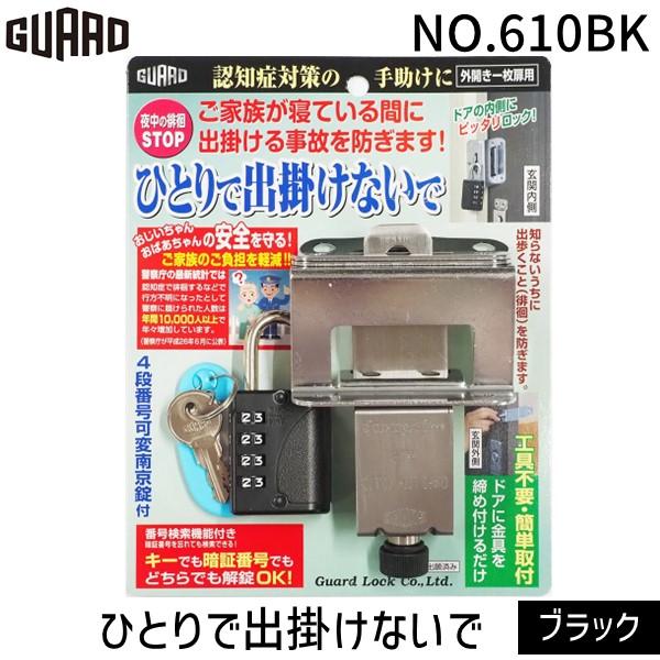 【商品説明】●認知症対策の手助けに!●ドアの内側にロック!これで誤っての外出を未然に防ぐ! ●新開発の番号検索機能付きシリンダーを装備! ●取付工具は一切不要! ●〈ひとりで出掛けないで〉は、玄関ドアの内側からロックして知らない間にひとりで出歩くことを防止する商品です。 ●認知症には様々な症状がありますが、認知症患者ご自身も事故に巻き込まれたりするケースもあり、昼夜を問わない『徘徊行動』が、周りのサポートするご家族の方の大きな負担にもなっています。●〈ひとりで出掛けないで〉は、ご家族の睡眠中や所用中にロックしておき、認知症患者が外出してしまうのを防ぎ、ご家族の介護負担を軽減します。●総人口に対していわゆる高齢者とされる65歳以上の割合が25%を越え、4人に1人が65歳以上という超高齢者社会となってきました。●認知症で徘徊するなどで行方不明になったとして警察に届けられた人数は年間10,000人以上で年々増加しています。●扉への固定には傷付防止部にゴム板を使用しております。ゴム板は経年変化により接触箇所にゴム跡が残る可能性がありますので予めご承知、ご了承くださいませ。 ●サイズ:取付金具/3.5×11.4×2.5cm ロック金具/5.3×5.1×8cm●重量:(約)400g●材質 取付金具:ステンレス製、ロック金具:ステンレス製、ロック本体:亜鉛合金製(塗装仕上げ)、ダイヤル部:亜鉛合金製(電着塗装仕上げ)、シャックル部:鉄製、メッキ仕上げ、キー:真鍮製(メッキ仕上げ)●製造国:日本