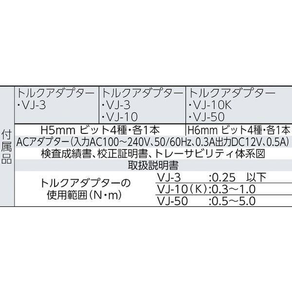 ベッセルメーカーお問い合わせ:0120-999-914【特長】●電動ドライバーのトルクチェックや管理に最適です。●2種類の測定モード(ピークホールド/ピークダウンホールド)で、戻しトルク測定に用いるトルクドライバーの精度チェックも可能です。(差込角9.5sq. (3/8))●複数回の測定で、最大・最小・平均値が取れます。●軽量コンパクトな充電式で工場での持ち運び測定に便利です。●測定データは800件まで本体に保存できます。(自動・手動切替可)。また、USBケーブルでパソコンに取り込み管理することもできます。(管理用フォーマットはベッセルホームページよりダウンロードできます。)●オートパワーオフ機能付きで節電になります。(最大12時間使用可能)【用途】●電動ドライバー、トルクレンチ、トルクドライバーの、トルクチェックやトルク管理に。【仕様】●差込角:9.5sq.(3/8)●適合機種:VE-1500(EPA)、VE-2000(EPA)●幅(mm):160●奥行(mm):55●高さ(mm):125●測定範囲(N・m):0.01~1.0●桁デジタル表示 (cN・m):0.010~100.0●測定表示:LCD4ソケット嵌合部寸法(mm):20×20/ 9.5×9.5●縦×横×厚さ(mm)【仕様2】●精度 VTM-8:±0.5% (リーディング※199digit以下は±3digit)、VTM-10/100:±0.5% (リーディング※199digit以下は±1digit)●電源:ニカド電池6V セル(700mAh) ●充電時間:約3時間●連続使用時間:約12時間●使用温度湿度範囲:温度19℃~29℃/湿度 48~63%RH(結露のないこと)●データメモリ:測定値 800 データ ●データ出力:アスキーフォーマット(ボーレート19200bps)●CE、RoHS ●バッテリー寿命:300 回以上充電(ただし使用状態により異なります) ●オートパワーオフ:10 分間放置後 電源OFF【セット内容/付属品】●付属品:トルクアダプター No.VJ-3、No.VJ-10、測定用ビット No.D73 H5×50 No.D76 H5×50 No.B34 H5×50 No.A16 H5×50、ACアダプター(入力AC100~240V、50/60Hz、0.3A 出力DC12V、0.5A)、検査成績書、校正証明書、トレーサビリティ体系図、取扱説明書【注意】●インパクト式の動力工具は測定できません。●校正証明書の更新は別料金で申し受けます。●データ取り込み用のUSBケーブルは付属しておりません。USB ケーブルA to B タイプ(両端オス)を別途ご購入ください。●安全にご使用いただくために必ず取扱説明書をお読みください。●適応品番は目安です。【原産国】日本