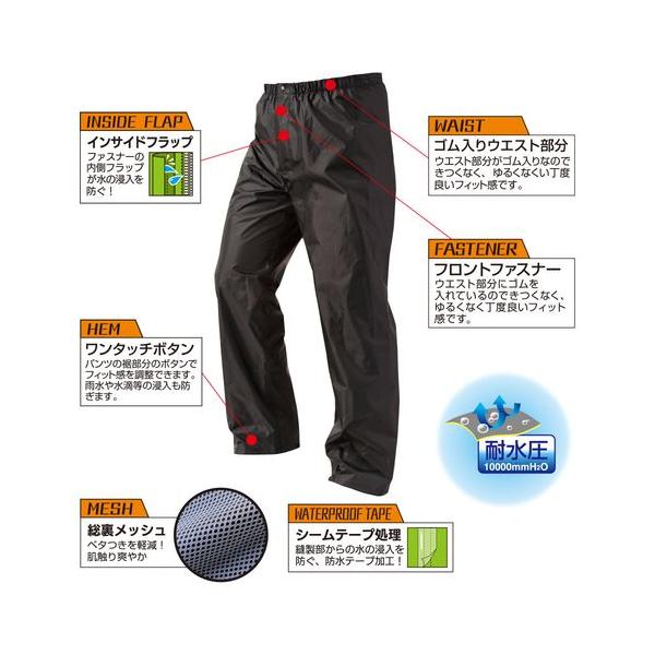 喜多メーカーお問い合わせ:0800-200-1697●履きやすく、防水性に優れたスタンダードなレインパンツ●ウエスト部分のゴム と フロントファスナーで、脱ぎ履きしやすい!●裾部分のワンタッチボタンで、フィット感を調整可能●サイズは、Mサイズ から ゆったり 大きい 5Lサイズ まで豊富に展開●高い 防水力 耐水圧 10,000mmH2O●蒸れやベタツキを防ぐサラサラ総裏メッシュ!●シームテープ加工 縫製部分の裏面には水滴の侵入を防ぐ防水テープを貼っています●パンツのみです(上着は別売り)●適用身長(cm):181~186●ウエスト(cm):112~122