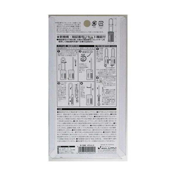 ノムラテックメーカーお問い合わせ:06-6756-7301●忘れた暗証番号を調べることができ、暗証番号リセット機能付きです。●ダイアル段数:4段●幅(mm):35●全長(mm):136●厚み(mm):14.3●吊内径高さ(mm):72●材質:シャックル部スチール●本体亜鉛ダイカストABS樹脂●ダイヤル:亜鉛ダイカスト●暗証番号リセットキー:真鍮