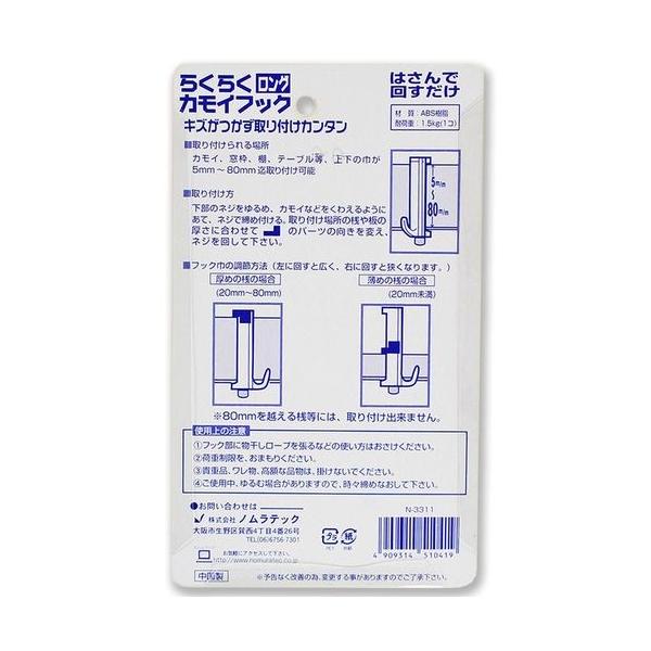 ノムラテックメーカーお問い合わせ:06-6756-7301●カモイや桟に締め付けて簡単に取り付けできます。●フック部に物干しロープを張るなどの使い方はおさけ下さい。●取り付けられる場所:カモイ、窓枠、桟、机、棚等、上下の巾が5~80mm迄取り付け可能。●耐荷重(kg):1.5●サイズ:17X102X43mm●材質:ABS樹脂