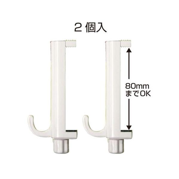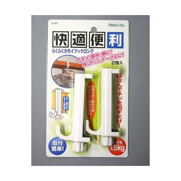 ノムラテックメーカーお問い合わせ:06-6756-7301●カモイや桟に締め付けて簡単に取り付けできます。●フック部に物干しロープを張るなどの使い方はおさけ下さい。●取り付けられる場所:カモイ、窓枠、桟、机、棚等、上下の巾が5~80mm迄取り付け可能。●耐荷重(kg):1.5●サイズ:17X102X43mm●材質:ABS樹脂