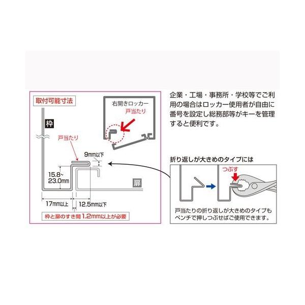※同一キー仕様品は取扱無し●4段番号錠を用いた、鉄製ロッカー用ロッカー錠(スタンダード)です。●工具不要取付簡単!番号違い1万通り!●常時固定、裏面にゴムマグネット付●錠タイプ:4段番号錠(黒)●アダプタープレート:ABS樹脂製、取付金具:ステンレス製、南京錠本体・ダイヤル部:亜鉛合金製(塗装仕上げ)、南京錠シャックル部:鉄製(メッキ仕上げ)、キー:真鍮製(メッキ仕上げ)、マグネット:異方性フェライト磁石