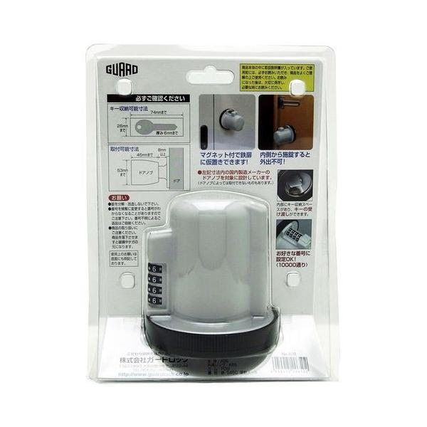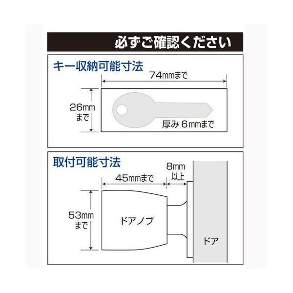 ※同一キー仕様品は取扱無し●ノブをすっぽりカバー、ワンタッチでスピードロック!キーの受け渡しができる!●鍵なしドアをロック!内側から施錠すると外出不可!ご家族が気づかない間に出歩くことを防ぎます!●不動産業の物件管理に!●工具不要!賃貸物件にも最適!●軽くて頑丈!高強度の樹脂素材を使用!●マグネット付で鉄扉に仮置きできます!●内部にキー収納スペースがあり、キーの受け渡しができます●お好きな番号に設定OK!(10000通り)●商品本体の中に取扱説明書が入っています。ご使用前には、必ずお読みいただき、商品をよくご理解の上ご使用ください。●お読みになった後は、大切に保存し、必要な時にお読みください。●錠を分解改造しないで下さい●番号を頻繁に変更すると番号がわからなくなることがありますのでご注意下さい。番号不明によるご返品はご容赦ください●商品の取り扱いにご注意ください。商品を落下させますと破損やケガの元になります●キー収納可能寸法:厚み6X26X74mmまで●本体/ABSなど