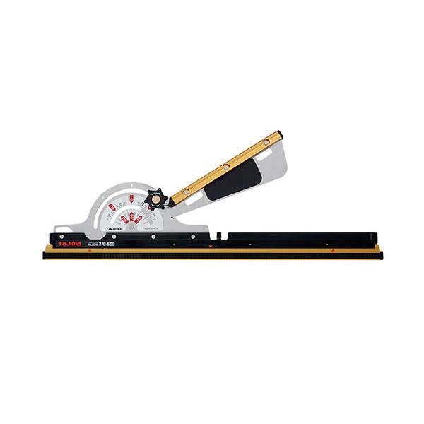 (株)TJMデザインメーカーお問い合わせ:0120-125577●長さ:370mm~600mm。●目盛:角度・勾配両目盛付。●目盛:15~165度。●有効切断長:370mm~600mm。●精度:200mmで±0.7mm以内。●【用途】丸鋸用角度切り定規。●【機能・特長】手前にスライドさせれば45度以下の鋭角切りや角材の切り始めも安定します。45度・90度・135度の主要3角度にカチッと止まるクリック機構です。押え部とガイド部に滑り止めゴムを採用しています。裏返しての使用も可能です。●【材質】本体:ステンレス・アルミ。固定ネジ:真鍮、ABS樹脂。滑り止め:ゴム。手や指をはさむ危険がありますので、ガイドと押さえ板はゆっくりと回して下さい。