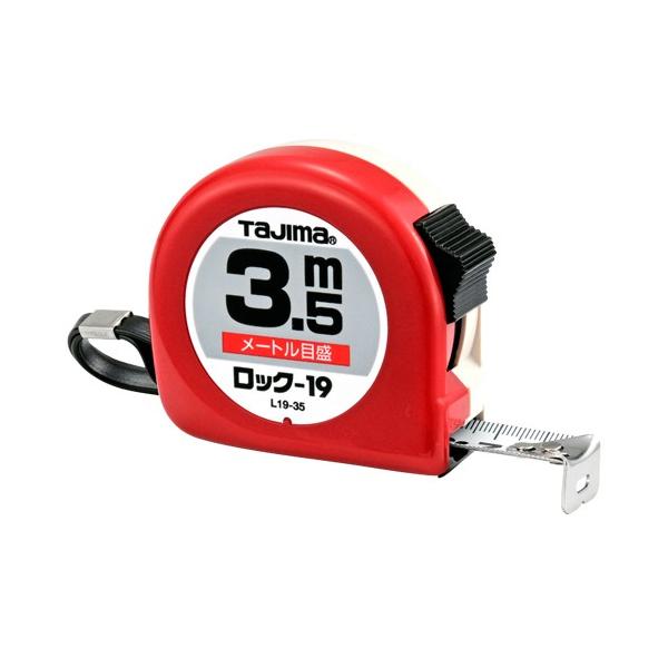 (株)TJMデザインメーカーお問い合わせ:0120-125577●目盛仕様:メートル目盛、JIS1級、両面目盛。●テープ幅:19mm。●テープ長さ:3.5m。●ヨンゴーゴーピッチ表示付。●ストラップ付。●ベルトクリップ付。●爪飛び防止用プロテクター付。●【用途】長さ測定用。●【機能・特長】テープを固定できる、ロックタイプです。0点補正移動爪です。ショックアブソーバー付です。●【材質】テープ:SK85(旧SK5)。バネ:SK85(旧SK5)。ケース:ABS樹脂。