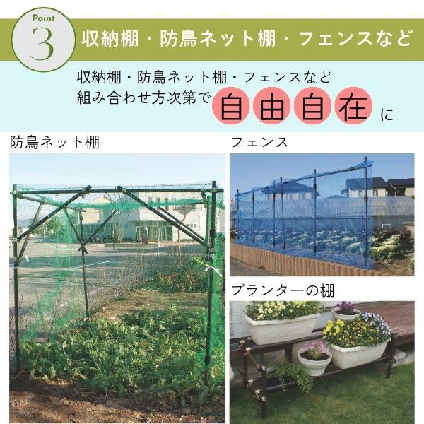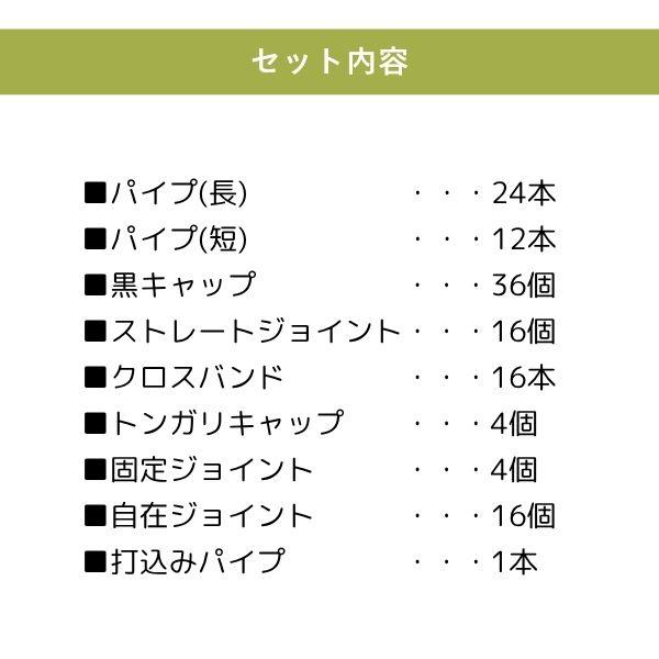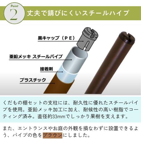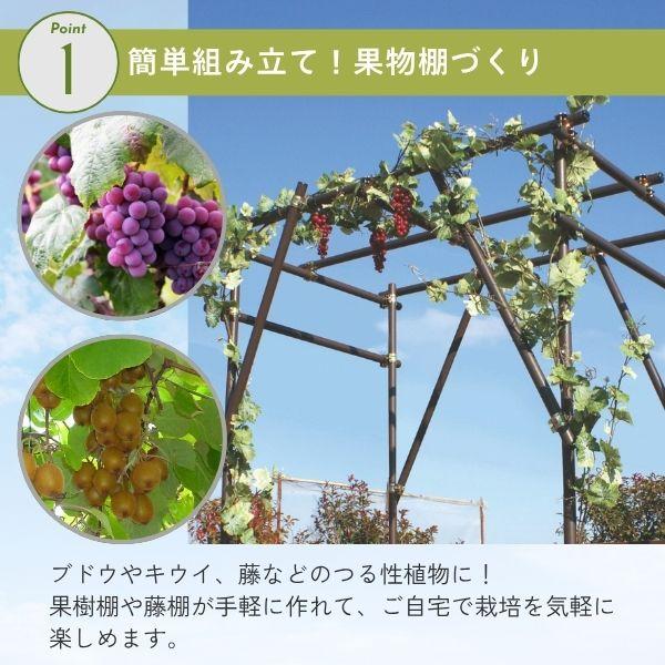 【商品説明】●パイプはすべて直径33mmのパイプを使用しているので、果樹をしっかり支えます。●耐久年数約5年で安心して長く使用して頂けます。●シンプルな形状で組み立て方法が分かりやすいです。●組立てにはプラスドライバーが必要です。●設置サイズ:幅約2m×奥行き約2m×高さ約2m(土中50cm埋め込み時)●材質:スチールパイプ樹脂コーティング、ナイロン、スチール、ポリエチレン、ABS