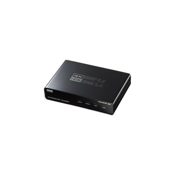 サンワサプライメーカーお問い合わせ:03-5763-0011【商品説明】●1台のHDMI機器の信号を高画質・高音質のまま2台のHDMI入力端子付き機器(ディスプレイ・プロジェクター等)に同時に分配出力できます。●4K2K(4096×2160)@60Hz解像度に対応しており、美しく高精細なHDMI信号を出力できます。●高輝度HDR(ハイダイナミックレンジ)映像に対応しており、HDCP2.2にも対応しています。●ポート1に接続されたディスプレイのEDID情報を映像入力機器(パソコン等)に伝える方式です。●Dolby True HDおよびDTS HD Master Audioにも対応しています。●対応機器:HDMI出力端子を標準搭載している映像機器・家庭用ゲーム機・パソコン●対応出力機器:HDMI入力端子を標準搭載しているテレビ・パソコン用ディスプレイなど●インターフェース:入力用:HDMI タイプA(19PIN)メス×1、出力用:HDMI タイプA(19PIN)メス×2●データレート(最大):6.0Gbit/s●ピクセルクロック:600MHz●最大解像度:4K2K(4096×2160)、主な対応解像度:4096x2160@60Hz (4:4:4)、4096x2160@60Hz (4:2:0)、3840x2160@60Hz (4:4:4)、3840x2160@60Hz (4:2:0)、1920×1200@60Hz、1920×1080@60Hz●入力DDC信号:5V●HDCP:HDCP 2.2対応●機器間制御(CEC):対応●消費電力:4.25W(本体)●稼動温度/湿度:温度0~50℃、湿度80%以下(結露なきこと)●保存温度/湿度:温度-20~60℃、湿度80%以下(結露なきこと)●材質:スチール●サイズ:W120×D80×H25mm●重量:358g(本体)●付属品:ACアダプタ(DC 5V/2.6A)、取扱説明書、保証書、HDMIケーブル(1.8m)×1