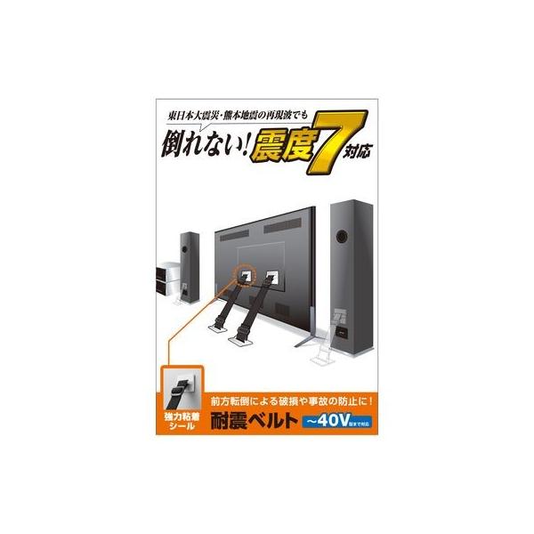 エレコムメーカーお問い合わせ:0120-898-794【商品説明】●対応画面サイズ:~40V型 ●外形寸法:固定パーツ:38.5mm×33.5mm、ベルト:幅18mm×350mm(取付時40mm~220mm) ●負荷荷重:1本約30kg×2本、2本使いの場合約60kg(垂直引張強度) ●その他:材質/ベルト:ポリプロピレン、固定部:ポリカーボネイト、粘着面:特殊粘着シール ●入り数:耐震ベルト2本