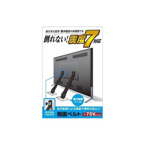 エレコムメーカーお問い合わせ:0120-898-794【商品説明】●対応画面サイズ:~75V型 ●外形寸法:固定パーツ:51mm×51mm、ベルト:幅18mm×800mm(取付時~700mm) ●負荷荷重:約50kg(垂直引張強度) ●その他:材質/ベルト:ポリプロピレン、固定部:ポリカーボネイト、粘着面:特殊粘着シール、ネジ ●入り数:耐震ベルト2本, ネジ各2個(M4、M5、M6、M8サイズ)