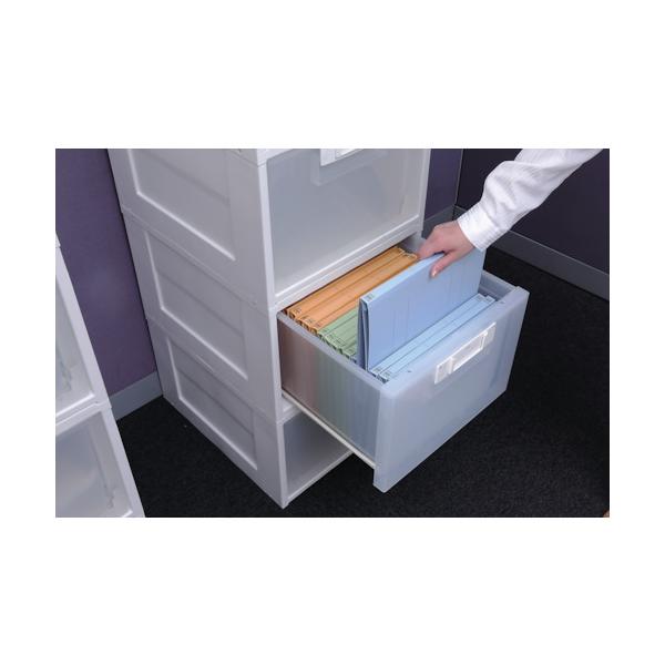 アイリスオーヤマメーカーお問い合わせ:0120-211-299【特長】●ファイル収納に最適な鍵付き、鍵なしの2タイプのオフィスチェストです。●満載時でも引き出しやすい金属レールを採用し、引き出し部分にはインデックスを入れることができます。●背幅50mmのA4ファイルが6冊収納可能です。●天板を付けたまま最大4段まで積み重ねることができます。●スタッキングした際に前倒れを防ぐ転倒防止パーツがついています。【用途】●収納【仕様】●色:ホワイト/クリア●間口(mm):425●奥行(mm):509●高さ(mm):309●容量(L):35.9●耐荷重(kg):引出し1段あたり約20●外形寸法(mm)奥行:509●外形寸法(mm)間口:425●外形寸法(mm)高さ:309●有効内寸(mm)奥行:440●有効内寸(mm)間口:320●有効内寸(mm)高さ:255●タイプ:鍵付●収納目安:A4ファイル約6冊(ファイル目安:W240×H310×とじ厚50mm)【仕様2】●スタッキング可能●積み重ね可能数:4段●引出内寸(約):320×440×255mm【材質/仕上】●ポリプロピレン(PP)●リベット:アルミニウム●レール・ねじ・カギ:スチール【注意】●複数積み重ねてご使用の際は全耐荷重(全ての引出し耐荷重の合計)が60kg以下になるようにご使用ください。【原産国】中国