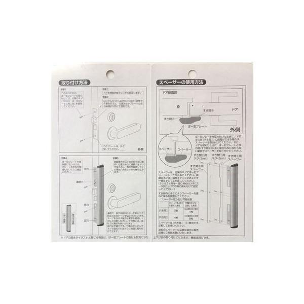 【商品説明】※同一キー仕様品は取扱無し●ドア厚&錠の機種を選ばず取付OK。●取付簡単、ドライバー1本で協力防犯。●品質表示プレート本体:ステンレス製(カラー仕上品は塗装若しくはメッキ仕上げ)端部キャップ:亜鉛合金、塗装仕上げスペーサー:ステンレス製5枚付●付属品本体固定ネジ(M4×12)2本スペーサー固定ネジ(M4×8)3本スペーサー固定ネジ(M4×12)3本本体補助固定ネジ(M3×12)2本●防犯プレート