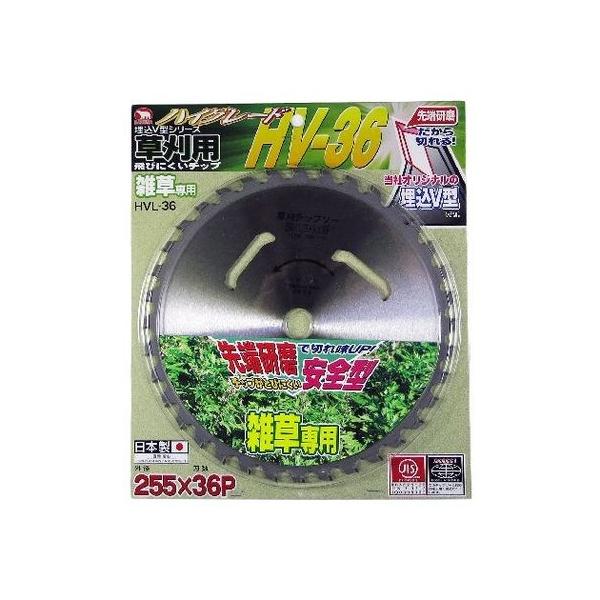 【商品説明】雑草カリバライ専用。お買得2枚入り。チップが飛びにくい埋込V型。先端研磨だから切れる! 台金:SK-5 外径:255mm 厚:1.25mm 刃数:36P <注意>石の多い所での使用や竹や雑木の刈払いには適しません。