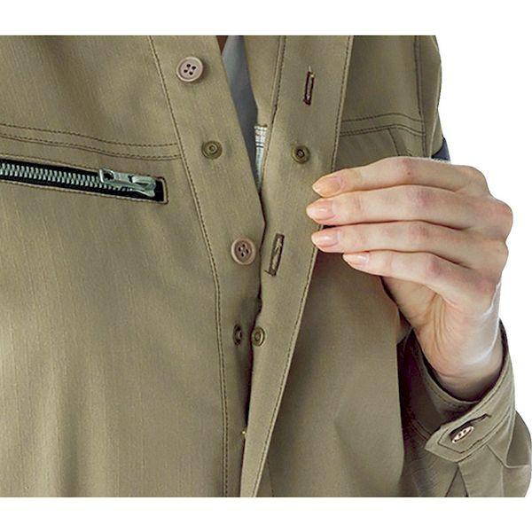 ミドリ安全メーカーお問い合わせ:048-989-3177【特長】●女性向けの機能と美しいシルエットを両立しました。●ボタンの間から下着がのぞかないように、表からは見えない隠しボタンを追加しました。●ストレッチ性のある生地を使用しています。●日本乳がんピンクリボン運動対象商品です。【用途】●作業現場用として。●建設業。●製造業。●運輸業。●点検・整備。●物流。●引っ越し。●ビルメンテナンス。●清掃。【仕様】●色:シルバーグレー●サイズ:11●着丈(cm):66●胸囲(cm):104【仕様2】●帯電防止作業服JIS適合品【材質/仕上】●ポリエステル80%、綿20%●リップストップ平織り●ファスナー、ボタン、ドットボタン:樹脂【注意】●海外生地・染色のため、若干の色ブレが発生することがあります。【原産国】ベトナム