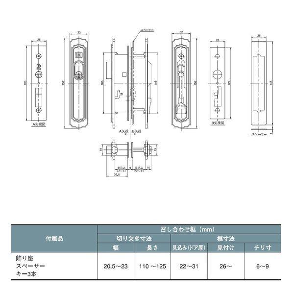アルファメーカーお問い合わせ:045-787-8431【商品説明】●ロッド式のスタンダード●付属品:飾り座、スペーサー、キー3本●召し合わせ框(mm)切り欠き寸法:幅 20.5~23長さ 110~120框寸法:見込み(ドア厚) 22~31見付け: 26~チリ寸:6~9