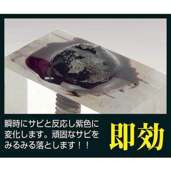 エンジニアメーカーお問い合わせ:06-6974-0028【特長】●瞬時に錆と反応し、極小部品であれば数秒で除錆できます。●取付状態のねじでも、すき間から奥へと浸透します。●液がサビと反応すると紫色に変化します。●中性ですので安全に作業できます(酸、アルカリを含みません)。【用途】●自動車、オートバイ、キッチン用品、農機具、配管部品などさまざまな場所の錆び取りに。【仕様】●容量(L):0.1●容量(g):100●高さ(mm):140●奥行(mm):40●幅(mm):40【仕様2】●液体タイプ【材質/仕上】●内容液:チオグリコール酸アンモニウム【注意】●除錆後は、水洗いの上、必ず防錆剤を塗布してください。●シミや変色の可能性がありますので、事前に目立たない部分でお試しください。●強い力が加わるバネやチェーン、ボルトなどの機械部品は、錆除去後でも再使用しないでください。【原産国】日本