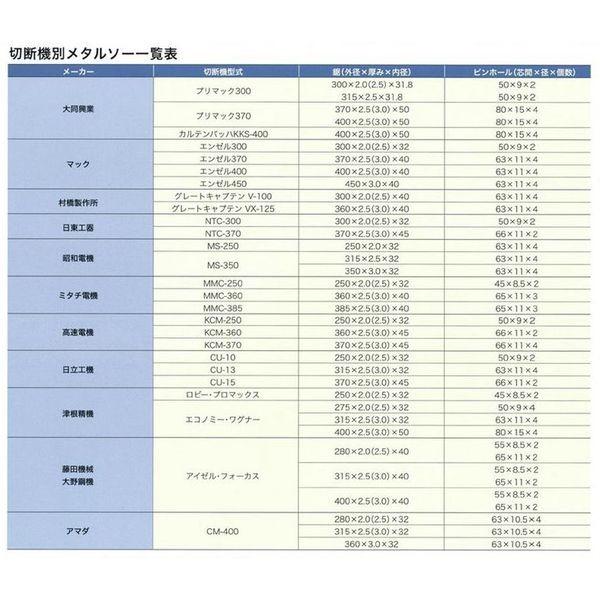 大同興業メーカーお問い合わせ:06-6531-0085【商品説明】●特に厳選された素材を基に、1枚1枚慎重に製作され、強靭な粘りと剛性を誇っております。●メーカー:大同興業●鋸(外径×厚み×内径):300×2.5×31.8