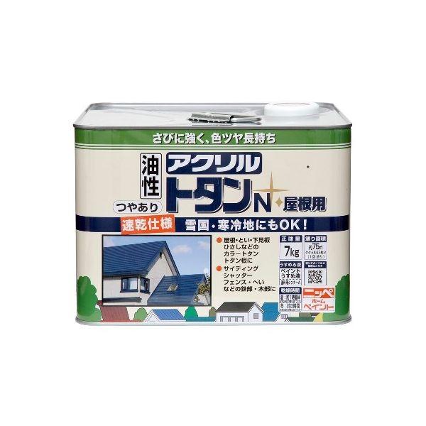 【商品説明】トタン屋根用塗料 つやあり さびに強い●特殊なアクリル樹脂を使用しているため、抜群の耐候性(耐久性)があります。●長時間、鮮明な色と美しいツヤを保ちます。●乾きが早いので、結露によるツヤびけや白化が少なくなりました。●ペイントうすめ液でうすめられ、はじめての方にも、ハケ、ローラーで簡単に塗ることができます。●用途:屋根・とい・下見板・ひさしなどのカラートタン・トタン板の塗り替えに最適。●用途:サイディング・シャッター・フェンス・へいなどの鉄部にも好適。●容量7kg。塗り面積(1回塗り)約75m2(畳約45枚分)●乾燥時間:夏(30℃):約1時間30分/冬(5℃):約3時間。●※塗り重ねは夏:約3時間以上、冬:約6時間以上乾燥させてから塗ってください。