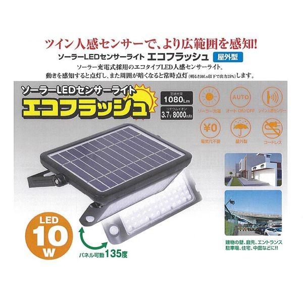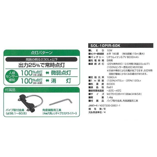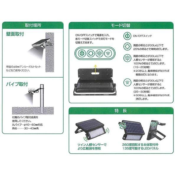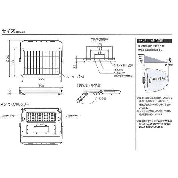 日動工業メーカーお問い合わせ:06-6905-6905【商品説明】●人感センサーで点灯するLEDセンサーライトです。●周囲が30Lx以下になると●センサーOFF:25%で常時点灯●センサーON:感知して100%点灯後、微弱点灯●センサーON:感知して100%点灯後、消灯の3パターンからモードを切替えられます。●配線工事不要のソーラー充電です。電気代0円!左右のツインセンサーにより、広範囲を感知します。