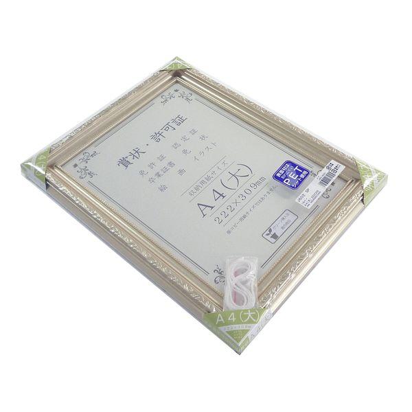【商品説明】●【材質】表面材:PETシート フレーム材:樹脂製●【裏板】MDFボード トンボ押さえ式●【包装形態】シュリンクパック。●【付属物】台紙、厚み調整材、吊カン、吊紐。●【収納寸法】222×309mm●華やかだけどキンキラキンではないプラチナ、シャンパンゴールド系の色合いの賞状額。●表面材をPETシートにすることで軽量化。●吊カンと吊紐が付いているので壁に掛けて飾ることができる。賞状 許可証 飾る 掛ける 吊るす 額 額縁 フレーム