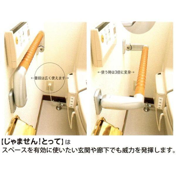 【商品説明】●邪魔にならない!折りたたみ式手摺!普段はスッキリたたんで、使うときはシッカリ持てます。高齢者の介護用品にもご利用いただけます。使用時は便座から立ち上がる際に”ひじ肘”感覚で体の近くで握っていただけるように設計されています。また、両側に手すりが欲しい方にも最適です。●折りたたみ時は壁面から50mmで、使用時は150mmと3倍に変身!●グリップにはぬくもりを感じる天然木を採用。人にやさしく、確実ににぎれるグリップデザインです。●付属のねじが壁の内部の柱に止まるように取り付けるだけ。(柱の間隔が合わない場合は、補強用の木板を取り付けて下さい) ●材質:手すり(天然木)/ブラケット(亜鉛ダイキャスト)/カバー板(ABS樹脂)/フィルム(PET)●同梱部品内容:手すり本体…1本、受座固定ネジ(SUS304 M4×38)…8本、コンクリートプラグ(7mm用)…8本●この製品の制限荷重は100kgです。(但し、静荷重での測定値で保証値では有りません)●木ネジのきく所(壁に木の下地がある所)を選んで取り付けて下さい。●柱の位置は市販の針状の道具などを使って手応えのあるところを探してください。