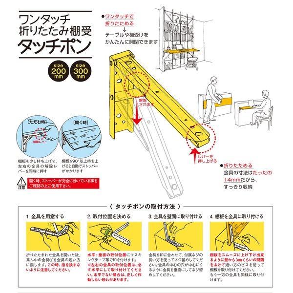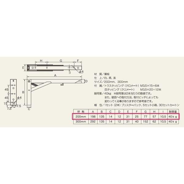 【商品説明】●ワンタッチで折りたたみ可能な棚受金具です。ワンタッチで折りたためるので、テーブルや棚受けをかんたんに開閉できます。金具の寸法はたったの14mmだから、すっきり収納!●材 質/鋼板●仕上:黒●サイズ:200mm●付属ビス:トラスタッピング(クロメート)M3.5 Xl5 (6本)、皿タッピング(クロメート) M3.5X20(12本)●耐荷重:40kg(※耐荷重は2本当たりの数値です。また、壁面への取付方法、取付ピッチによっても変わってくる事がありますので参考値です。)●梱 包:1セット(2本)ブリスターパック入