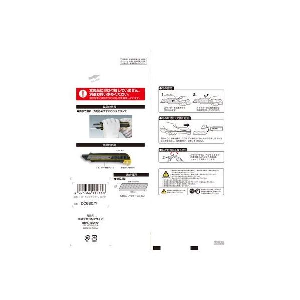 (株)TJMデザインメーカーお問い合わせ:0120-125577【商品説明】●張り・腰の強い0.65mm厚刃(L型刃の2.5倍 当社比)●曲り・しなりにくい22mm幅●ピッチはL刃と同じ10mm●石膏ボード/内装材切断に最適●グリップ部約180mmのロンググリップ、切るスピードとパワーが倍増●腰袋で携帯できるコンパクトサイズ●しっかり握れて滑りにくいエラストマー樹脂グリップ●ホルダーがブレード背側をしっかりホールドする設計でブレードが折れにくい●スライダーは確かなクリック感の伝わる精音スライダー●用途:断熱材、石膏ボード、ベニヤ板などの切断●替刃タイプ:J型極厚替刃●ホルダー:強度3.5倍1mm厚の硬質焼入れホルダー(当社比)●本体に替え刃は付属されていません●タジマ カッター