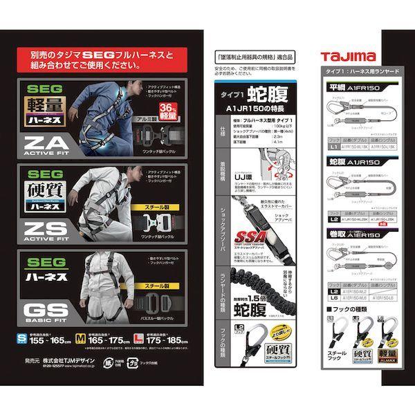 (株)TJMデザインメーカーお問い合わせ:0120-125577【特長】●フルハーネス型用 タイプ1です。●シングルL2ランヤードは伸縮性のある蛇腹式ロープです。●不使用時は短くなるので邪魔になりません。●より戻し付です。【用途】●新規格対応ハーネス用ランヤード【仕様】●色:黒●長さ(mm):1500●フック口開き(mm)構造物側:55●フック口開き(mm)人体側:9●ランヤード幅×長さ(mm):16.5×1500【仕様2】●厚生労働省「墜落制止用器具の規格」規格品●最大使用可能質量:100kg●種類:フルハーネス型●ショックアブゾーバ種別:第一種(4kN)●最大自由落下距離:2.3m●落下距離:4.1m●ランヤード種別:タイプ1【材質/仕上】●フック:スチール●ロープ:ナイロン●接続環:スチール【注意】●墜落制止用器具(安全帯)及び墜落制止用器具(安全帯)関連具は消耗品であり、使用しているうちに摩耗等により性能が低下しますので適切な時期に交換してください。●ご使用前に取扱説明書を必ずお読みください。●製品仕様は予告なく変更する場合がございます。●予めご了承ください。【原産国】日本