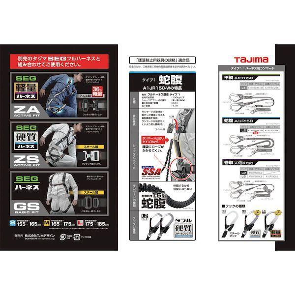 (株)TJMデザインメーカーお問い合わせ:0120-125577【特長】●フルハーネス型用 タイプ1です。●上出しダブルL2ランヤードだから腰周りの邪魔になりにくいです。●ショックアブゾーバがブラブラしない固定ベルト付きです。●伸縮性のある蛇腹式ロープ不使用時は短くなるので邪魔にならなりません。●より戻し付です。【用途】●新規格対応ハーネス用ランヤード【仕様】●色:黒●長さ(mm):1500●フック口開き(mm)構造物側:55●フック口開き(mm)人体側:9●ランヤード幅×長さ(mm):16.5×1500【仕様2】●厚生労働省「墜落制止用器具の規格」規格品●最大使用可能質量:100kg●種類:フルハーネス型●ショックアブゾーバ種別:第一種(4kN)●最大自由落下距離:2.3m●落下距離:4.1m●ランヤード種別:タイプ1【材質/仕上】●フック:スチール●ロープ:ポリエステル+ベクトラン●接続環:スチール【注意】●墜落制止用器具(安全帯)及び墜落制止用器具(安全帯)関連具は消耗品であり、使用しているうちに摩耗等により性能が低下しますので適切な時期に交換してください。●ご使用前に取扱説明書を必ずお読みください。●製品仕様は予告なく変更する場合がございます。●予めご了承ください。【原産国】日本