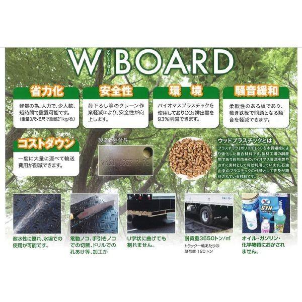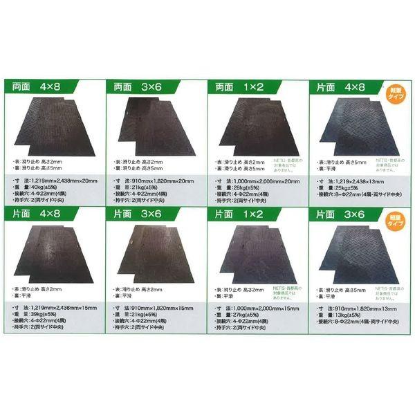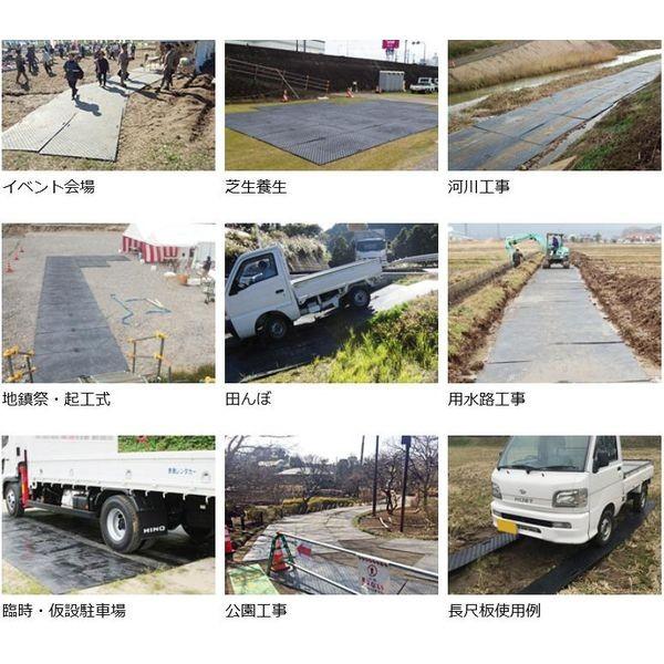 ※個人宅への配送が不可商品となります。法人様名のご明記をお願い致します。【商品説明】●商品特徴:コンクリートやアスファルトの上への設置がおすすめな片面(裏面フラット)タイプの樹脂製敷板(養生敷板)。敷鉄板より軽量、運搬・施工が簡単で需要が伸びています。プラスチック製よりもさらに安くて環境負荷が少ないのが特長です。工事用樹脂製敷板の決定版!今までに無かった便利サイズの長尺板はビニールハウスの通路用や軽トラ走行の養生用に最適!国土交通省「NETIS」登録製品。軽量の為、輸送費大幅削減可能。少人数、短時間で設営可能。クレーン作業不要により安全且つ労災防止。敷鉄板に比べ輸送時、設営時の騒音緩和。国内2ヶ所の最新工場で安定生産!東京大学発!複合プラスチック素材採用強度に優れ、環境にやさしい樹脂製敷板国土交通省 NETIS(公共工事等における新技術活用システム)鳥取県新技術・新工法活用システム登録(公益財団法人鳥取県建設技術センター)岡山県 新商品による新事業分野開拓事業認定(岡山県)福岡県 新技術・新工法ライブラリー登録(福岡県県土整備部)●材質:ウッドプラスチック●色:黒(ブラック)●表面:片面凸●サイズ(幅×長さ×厚み):1219×2438×15mm●重量:39kg(±5%)●耐荷重(最大車両荷重):120トン●表面仕様:表面:滑り止めリブ成形、高さ2mm/裏面:平滑●連結穴仕様:板四隅にΦ22穴開け●使用例:イベント会場、芝生養生、河川工事、地鎮祭・起工式、田んぼ、用水路工事、臨時・仮設駐車場、公園工事など●注意:設置・撤去・移動時等、人の手で取り扱う際は、必ず作業用手袋を着用して下さい。軽量の為、車両の走行によりズレが生じる場合があります。台風などの突風で飛ばされる場合があります。荒天が予想される場合は固定もしくは撤去して下さい。樹脂製品の為、季節による急激な気温変化により反りや収縮が発生する事がございます。鉄製クローラー車両の走行は破損のおそれや摩耗が早まります。砕石、コンクリートガラ等、敷板に鋭利な物が刺さる条件では破損のおそれがあります。敷板を固定した状態での持ち上げや、敷板上に物を載せた状態での移動は破損のおそれがあります。敷板の固定を解除、または敷板上から物を降ろして移動させて下さい。側溝や段差など敷板の下に空間がある条件での使用。 クレーンのアウトリガー用敷板としての使用。軟弱地盤や崩落の恐れがある地盤での使用。製品上でのたき火、溶接火花等による火気使用。黒板 ジュライト スーパージュライト 敷鉄板 ゴムマット グランドプラボード シキラーク BANBAN ワニ板