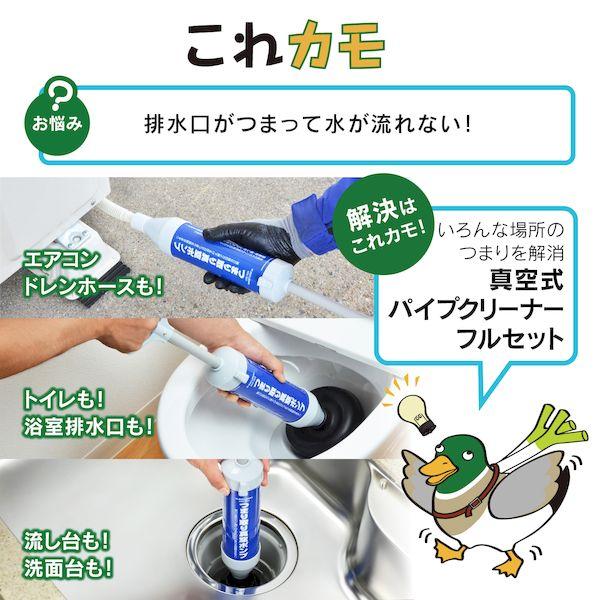 カクダイメーカーお問い合わせ:06-6538-1124【商品説明】●トイレ・浴室排水口・洗面台・流し台・エアコンドレンホース用の真空式パイプクリーナーフルセットです。ほとんどの場所の詰まりに対応できます。●強力な吸引力と押し下げる圧力で詰まりや汚物を取除きます。●パイプクリーナーの先端は取外しでき、同梱の先端パーツで様々な用途に使用可能です。