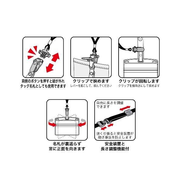 【商品説明】●取り外しができる脱着式クリップです。両側のボタンを押すと紐が外れ、タッグ名札としても使用できます。●安全装置、長さ調整付●ひも:再生PET●ひも:長さ約90cm/幅約10mm