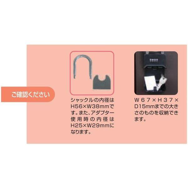 株式会社日本ロックサービスメーカーお問い合わせ:03-5395-7455【商品説明】●キーなどの小物を収納できるキーボックスです。●専用アダプターでレバーハンドルへも取り付けできます。●施解錠はダイヤル式で暗証番号は任意の番号に設定できます。●シャックルは脱着式で取付に便利です。また、ビニールのラバー付きなので、ノブ、レバーを傷つけません。●シャックルの内径はH56×W38mmです。また、アダプター使用時の内径はH25×W29mmになります。●W67×H37×D15mmまでの大きさのものを収納できます。●ダイヤルが「0」の位置でカチッと止まるので、夜間でもダイヤルを合わせやすい設計です。シャックルがはずせるので、ドアに傷を付けにくい仕様です。