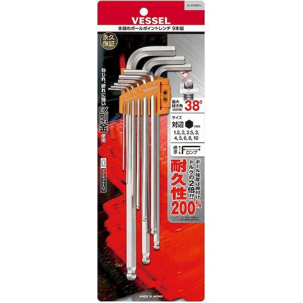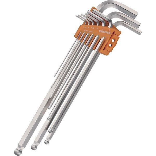 ベッセルメーカーお問い合わせ:0120-999-914【特長】●奥深い場所に最適なロングタイプです。●ねじれ、折れに強いEX剛金を使用しています。●傾き角度は最大38°(設計値)です。●レンチを傾けると駆動する位置が六角穴の入り口付近に移動するため、首部が太くても傾き角度が最大38°得られます。●ネジを緩めるときに障害物に接触しても、レンチが抜けやすい設計になっています。●ボール部が六角穴にはまり込んで抜けなくなることがありません。●永久保証付きです。●(過度な使用方法による破損や変形、摩耗や消耗は適用外です。●)●六角穴付ボルトの保持が可能です。【用途】●各種金型、工作機械類、ロボット、自動機、自動車、二輪車整備などの各種組み立て、メンテナンスに。【仕様】●首下寸法(mm):57●全長(mm):80.5、2…97、2.5…112.5、3…129、4…146、5…165、6…186、8…208、10…234●セット内容(mm):1.5、2、2.5、3、4、5、6、8、10●セット内容(本):9【仕様2】●EX剛金●傾き角度38°●全身熱処理●マグネット入り【材質/仕上】●軸:ビット材【セット内容/付属品】●ホルダ【注意】●正しい用途・サイズ・使い方を確かめてご使用ください。●家庭ではお子様に注意して保管してください。●予告なく、仕様、サイズを変更することがあります。【原産国】日本