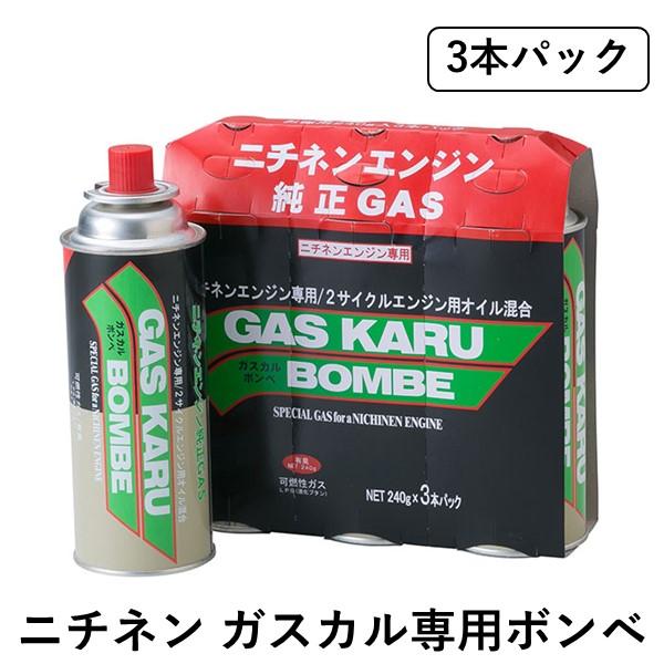 【商品説明】【用途】ニチネン刈払機ガスカル専用カセットボンベ。【機能・特徴】1本容量240g液化ブタン・2サイクルエンジン用オイル混合です。【仕様】●3本パック。●容量:(1本あたり)240g。【材質】●液化ブタン・エンジン用オイル混合。【注意事項ほか】エンジンオイルを配合している為、カセットコンロでは使用できません。園芸機器 刈払機 エンジン式刈払機