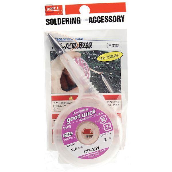 【特長】●精密機器にも安心してご使用になれます。ステンレス口金付です。●ディスペンスケース入りで持ちやすく、指先も熱くなりません。●鉛フリーはんだ対応です。【用途】●プリント基板のはんだ除去。【仕様】●幅(mm):2.0●長さ(m):2【原産国】日本