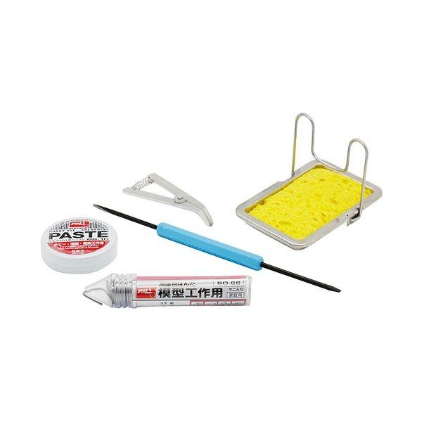 【商品説明】【用途】電気部品等のはんだ付けサポート材。【機能・特徴】お得な道具・材料のセットです。別売りの付芯はんだこてと一緒にお使いください。模型工作用はんだ・こて台・ヒートクリップ曲がり・ペースト・ソルダーアシスト(角リーマー・丸リーマー)の5点セットです。【仕様】●はんだ組成:錫50パーセント、鉛50パーセント。●はんだ径:1.2mm、長さ約2.6m。●はんだ融点:183-215度。●セット内容:模型工作用はんだ・こて台・ヒートクリップ曲がり・ペースト・ソルダーアシスト(角リーマー・丸リーマー)。作業工具 はんだ トーチ 半田補助具
