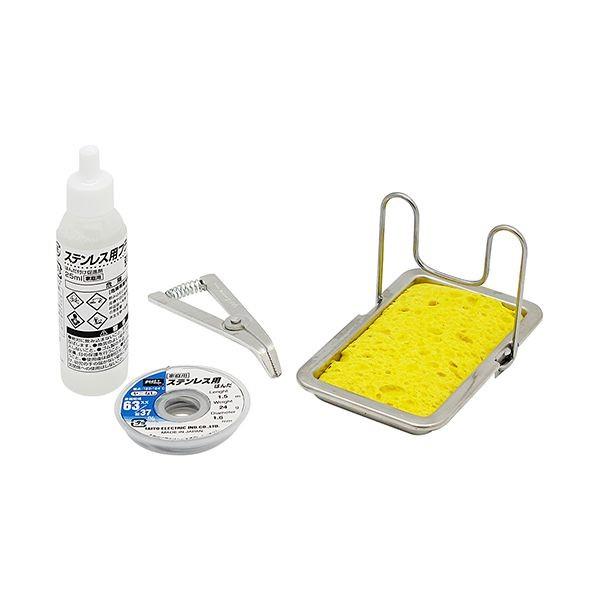 【商品説明】【用途】ステンレス製品などの製作・補修のサポート材。【機能・特徴】お得な道具・材料のセットです。別売りの付芯はんだこてと一緒にお使いください。ステンレス用はんだ・こて台・ヒートクリップ曲がり・ステンレス用フラックスの4点セットです。【仕様】●はんだ組成:錫63パーセント、鉛37パーセント。●はんだ径:1.5mm、長さ約1.5m。●はんだ融点:183-184度。●セット内容:ステンレス用はんだ・こて台・ヒートクリップ曲がり・ステンレス用フラックス。【注意事項ほか】●ステンレスフラックス使用後ははんだ付け箇所の水洗が必要です。作業工具 はんだ トーチ 半田補助具