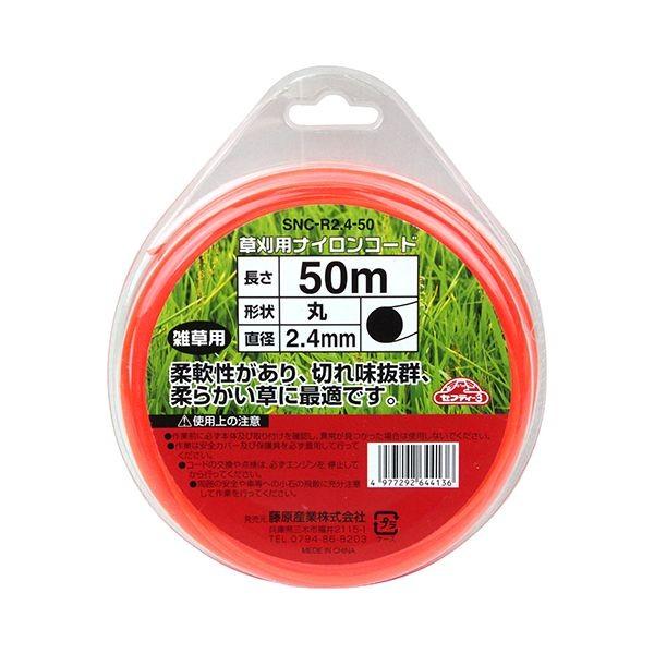 【商品説明】【用途】刈払機用ナイロンコード。【機能・特徴】柔軟性があり、切れ味抜群です。柔らかい雑草に最適です。【仕様】●長さ:50m。●形状:丸。●直径:2.4mm。●雑草用。【注意事項ほか】●作業前に必ず本体および取付けを確認し、異常が見つかった場合は使用しないで下さい。作業は安全カバー及び保護具を必ず着用して行って下さい。●コードの交換や点検は必ずエンジンを停止してから行って下さい。周囲の安全確認や車等への小石の悲惨に十分注意して作業を行って下さい。園芸機器 刈払機 ナイロン