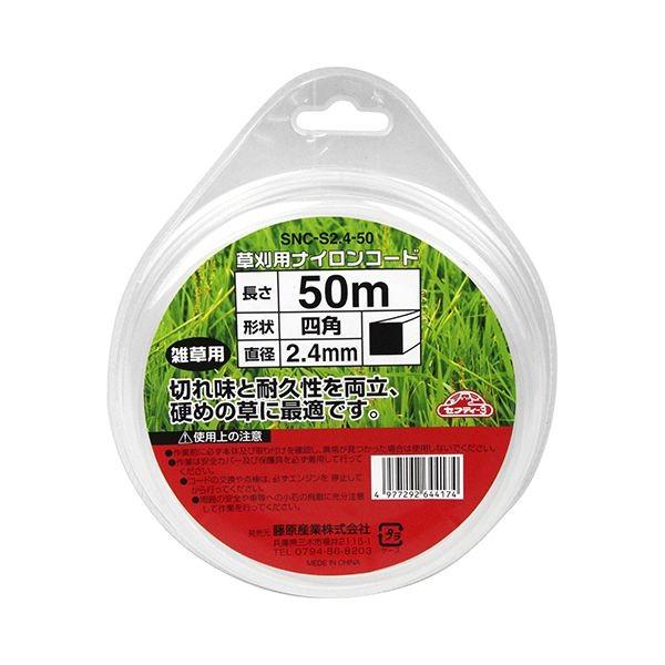 【商品説明】【用途】刈払機用ナイロンコード。【機能・特徴】切れ味と耐久性を両立しているので硬めの草にも最適です。【仕様】●長さ:50m。●形状:四角。●直径:2.4mm。●雑草用。【注意事項ほか】●作業前に必ず本体および取付けを確認し、異常が見つかった場合は使用しないで下さい。作業は安全カバー及び保護具を必ず着用して行って下さい。●コードの交換や点検は必ずエンジンを停止してから行って下さい。周囲の安全確認や車等への小石の悲惨に十分注意して作業を行って下さい。園芸機器 刈払機 ナイロン