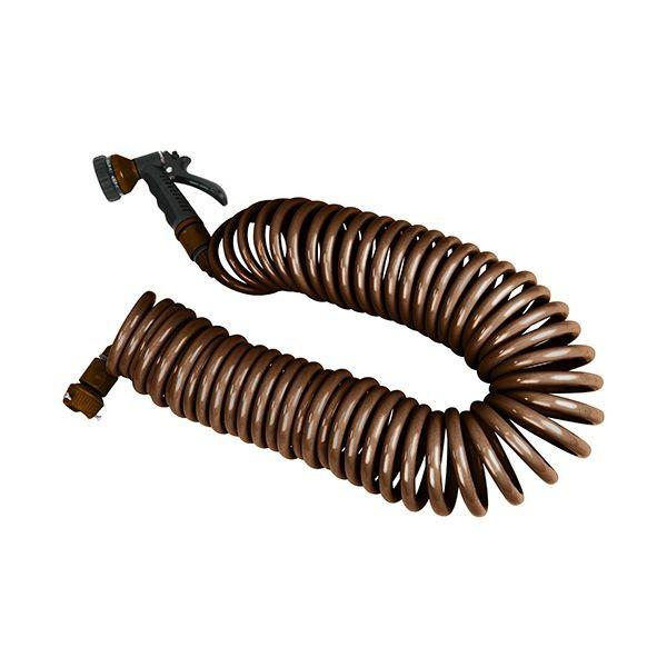 【商品説明】【用途】水まき・掃除・洗車など多用途対応の散水コイルホース。【機能・特徴】8mmホース採用で節水効果が従来品の約30%あります。使い終わればすぐに戻ります。藻が発生しにくいホースを採用しています。散水ノズルは7パターンです。【仕様】●ホース内径:8mm。●ホース外径:13mm。●有効使用範囲:15m。●散水パターン:ジェット・シャワー(大・小)・ジョウロ・ストレート・溢水・霧。●耐水圧:0.6MPa(7kgf/cm)。●耐熱温度:0~40度。●色:ブラウン。【材質】●