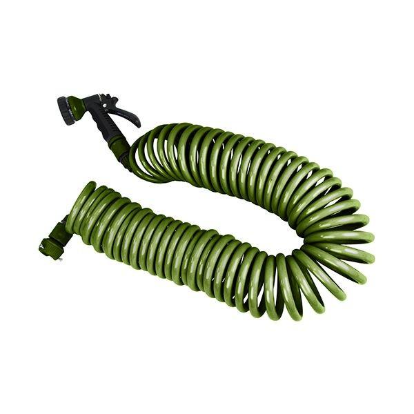 【商品説明】【用途】水まき・掃除・洗車など多用途対応の散水コイルホース。【機能・特徴】8mmホース採用で節水効果が従来品の約30%あります。使い終わればすぐに戻ります。藻が発生しにくいホースを採用しています。散水ノズルは7パターンです。【仕様】●ホース内径:8mm。●ホース外径:13mm。●有効使用範囲:15m。●散水ノズル:7パターン。●耐水圧:0.6MPa(7kgf/cm)。●耐熱温度:0~40度。●色:オリーブ。【材質】●ホース部:軟質塩化ビニール。●ノズル・アタッチメン