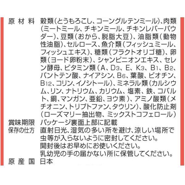 こちらの商品は、ご注文後納期確定まで約8日かかります。【商品説明】原材料:穀類(とうもろこし、コーングルテンミール)、肉類(ミートミール、チキンミール、チキンレバーパウダー)、豆類(おから、脱脂大豆)、油脂類(動物性油脂、ガンマ-リノレン酸)、セルロース、魚介類(フィッシュミール:DHA・EPA源 、フィッシュエキス)、糖類(フラクトオリゴ糖)、卵類(ヨード卵粉末)、シャンピニオンエキス、ビール酵母、ビタミン類(A、D3、E、K3、B1、B2、パントテン酸、ナイアシン、B6、葉酸、ビオチン、B12、コリン、イノシトール)、ミネラル類(カルシウム、リン、ナトリウム、カリウ