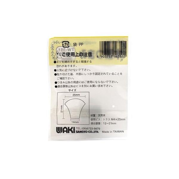 【商品説明】●木製家具に多いパイン材をツマミにしました。●扉のツマミを取替えや交換・追加に。●ビスを締めすぎると破損する恐れがあります ●取付け後にしっかり固定されていることをご確認下さい ●適合扉厚以外はビスを別にお買い求め下さい ●用途以外ではご使用にならないで下さい●適合扉厚(mm):12~21●設置方法:裏ネジ止めタイプ●高さ(mm):21●幅(mm):25●設置面(mm):14●材質:天然木(パイン/クリアー仕上げ)●付属品:トラスビスM4X25mm