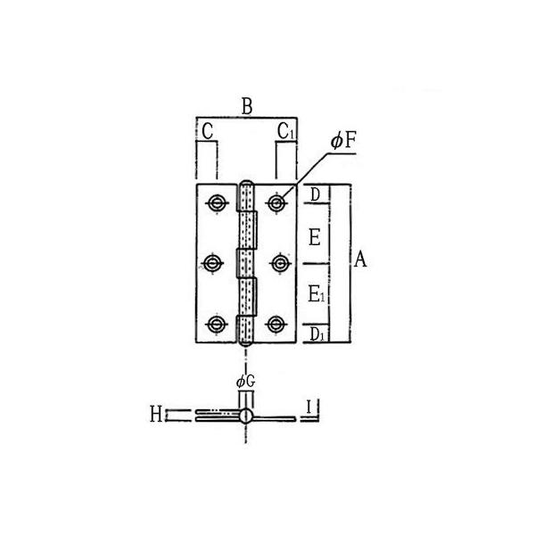 【商品説明】●木製の扉や家具、小箱用丁番。●取り付けの際、木部の割れを防ぐためキリで下穴を開けてください。●A(mm):51●B(mm):30●C・C1(mm):6●D・D1(mm):7●E・E1(mm):13●F(mm):4●G(mm):4●H(mm):4●I(mm):0.7●材質:SUS430●商品2枚