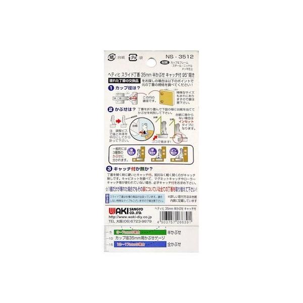 【商品説明】●システムキッチン、洗面ユニット等に・・・●板が反っていたり特殊な丁番等、取り替えが困難な場合もあります。よくご確認ください。●キャッチ付の場合バネが強いので指等をはさまない様に御注意ください。●無理な御使用等による損害天災時等の保証は致しかねます。●スライド丁番は多種の商品が出回っています。適合しない特殊なタイプもございますので御注意下さい。●1個だけ壊れた場合でもその扉についているすべての丁番を取り替えて下さい!●規格:35mm●タイプ:半かぶせ キャッチ付●開き(°):95●材質:カップ&フレーム/スチール、ニッケルメッキ仕上
